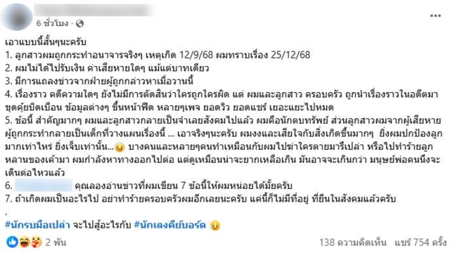 4. เรื่องราว คดีความใดๆ ยังไม่มีการตัดสินว่าใครถูกใครผิด แต่ ผมและลูกสาว ครอบครัว ถูกนำเรื่องราวในอดีตมาขุดคุ้ยบิดเบือน ข้อมูลต่างๆ ขึ้นหน้าฟีด หลายๆ เพจ ยอดวิว ยอดแชร์ เยอะแยะไปหมด