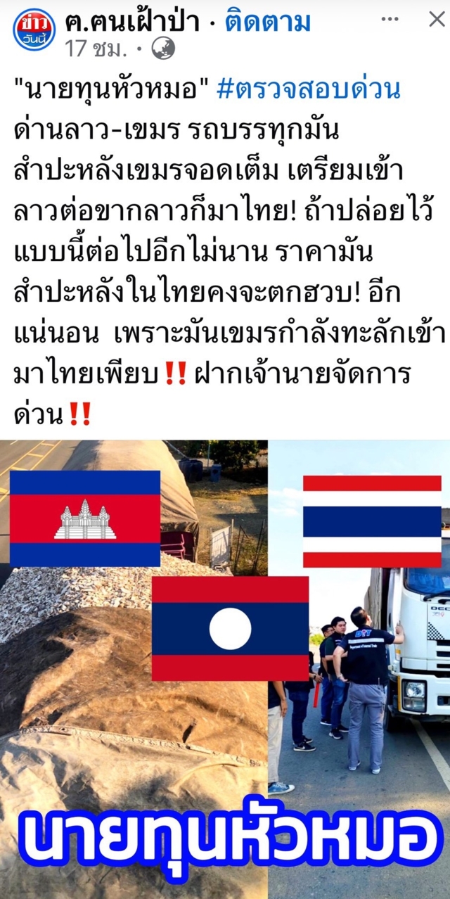 เกิดกระแสในโลกออนไลน์ที่มีการเผยแพร่คลิปและภาพรถบรรทุกจำนวนมาก อ้างว่าเป็นการขนมันสำปะหลังจากประเทศกัมพูชา ลักลอบเข้ามาในประเทศไทยโดยอ้อมผ่านแนวชายแดนสปป.ลาว สร้างความกังวลให้กับประชาชนตามแนวชายแดนอย่างกว้างขวาง โดยเฉพาะในช่วงที่ด่านชายแดนไทย–กัมพูชามีมาตรการควบคุมเข้มงวด ส่งผลให้ราคามันสำปะหลังในประเทศขยับตัวดีขึ้น เคยสูงถึงกิโลกรัมละประมาณ3 บาท หลังก่อนหน้าช่วงเปิดด่านราคา1.25 บาทเท่านั้น