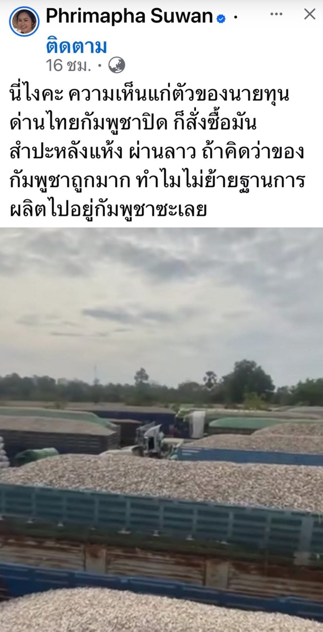 ขณะเดียวกัน เสียงสะท้อนในโซเชียลยังพุ่งเป้าไปที่กลุ่มนายทุนและโรงแป้งมันรายใหญ่เป็นผู้มีอิทธิพลบางแห่ง ขอให้เห็นแก่ประเทศชาติและเกษตรกรไทย อย่าฉวยโอกาสหาประโยชน์จากมันสำปะหลังราคาถูกจากต่างประเทศ พร้อมย้ำให้ตระหนักถึงความเสียสละของเจ้าหน้าที่และทหารที่ปฏิบัติหน้าที่ดูแลชายแดนด้วย อย่าเห็นแก่ประโยชน์ส่วนตัวบนความลำบากของเพื่อนร่วมชาติ