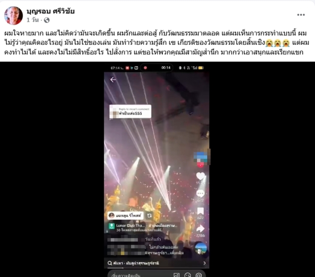 ต่อมานายบุญรอบ ศรีวิชัย หรือ เอกชัย ศรีวิชัย ศิลปินนักร้องและผู้กำกับภาพยนตร์อนุรักษ์ศิลปวัฒนธรรมภาคใต้ เรื่องโนราห์,เทริดฯลฯ ได้โพสต์บนเฟซบุ๊กเกี่ยวกับกรณีผับชื่อดังแห่งหนึ่ งในตัวเมืองสุราษฎร์ธานี จัดให้มีดีเจเปิดเพลงและให้แดนเซอร์ผู้หญิง 4 คน สวมชุดเครื่องมโนราห์ออกมาเต้นประกอบเพลงในลักษณะโคโยตี้ “ผมใจหายมากและไม่คิดว่ามันจะเกิดขึ้น ผมรักและต่อสู้กับวัฒนธรรมมาตลอด แต่ผมเห็นการกระทำแบบนี้ผมไม่รู้ว่าคุณคิดอะไรอยู่ มันไม่ใช่ของเล่น มันทำร้ายความรู้สึกเกียรติของวัฒนธรรมโดยสิ้นเชิง แต่ผมคงทำไม่ได้และคงไม่ไม่มีสิทธิ์อะไรไปสั่งการแต่ขอให้พวกคุณมีสามัญสำนึกมากกว่าเอาสนุกและเรียกแขก”