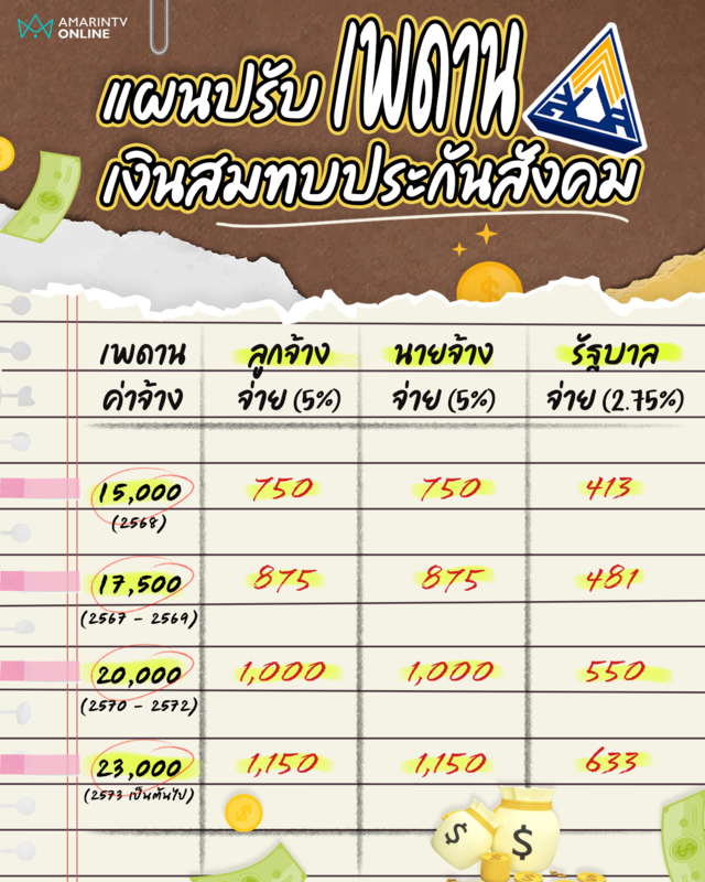 เพดานค่าจ้างขยับจาก 15,000 บาท เป็น 17,500 บาท ส่งผลให้ผู้ประกันตนตามมาตรา 33 ต้องจ่ายเงินสมทบสูงสุดเดือนละ 875 บาท นายจ้างสมทบอีก 875 บาท และรัฐบาลสมทบประมาณ 481 บาท