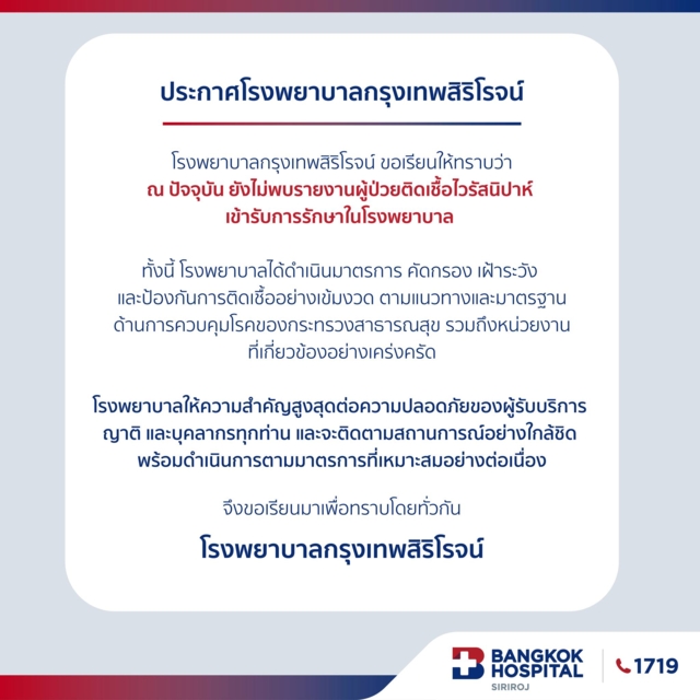 “จากกรณีมีเพจโพสต์เรื่องชาวอินเดียกักตัว ณ โรงพยาบาลกรุงเทพสิริโรจน์นั้น ทางโรงพยาบาลฯขอเรียนให้ทราบว่า ณ ปัจจุบันยังไม่พบรายงานผู้ป่วยติดเชื้อไวรัสนิปาห์ เข้ารับการรักษาในโรงพยาบาล