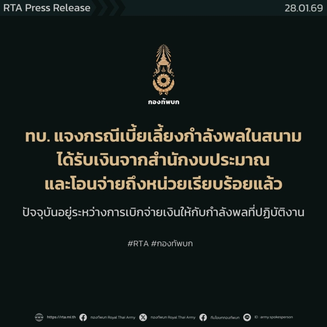 ปัจจุบันกองทัพบกได้รับโอนเงินจากสำนักงบประมาณแล้ว และได้ดำเนินการเร่งโอนจ่ายต่อไปยังหน่วยปฏิบัติราชการสนามทันที โดยกระบวนการโอนเงินทั้งหมดเสร็จสิ้นแล้วเมื่อสัปดาห์ที่ผ่านมา ขณะนี้แต่ละหน่วยอยู่ในขั้นตอนการเบิกจ่ายเงินให้ถึงมือกำลังพลโดยเร็วที่สุด