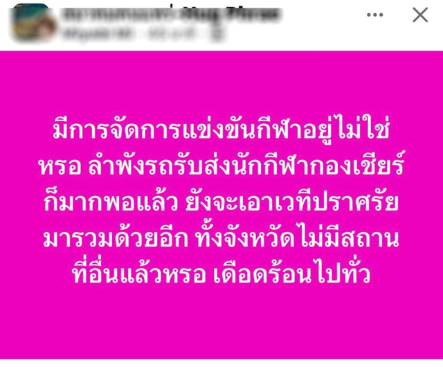 ทั้งนี้เป็นที่วิพากษ์วิจารณ์การจัดคิวปราศรัยของพรรคเพื่อไทย ซึ่งมีการแจ้งคิวมาแทรกในภายหลัง ส่งผลกระทบต่อการจัดการแข่งขันกีฬาเยาวชนแห่งชาติ