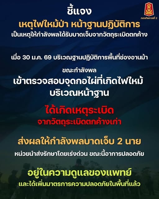 กองทัพภาคที่ 2 ขอแสดงความห่วงใยต่อกำลังพลที่ได้รับบาดเจ็บ และได้กำชับทุกหน่วยเพิ่มความเข้มงวดด้านความปลอดภัย โดยเฉพาะการเฝ้าระวังวัตถุระเบิดตกค้าง พร้อมติดตามอาการอย่างต่อเนื่อง