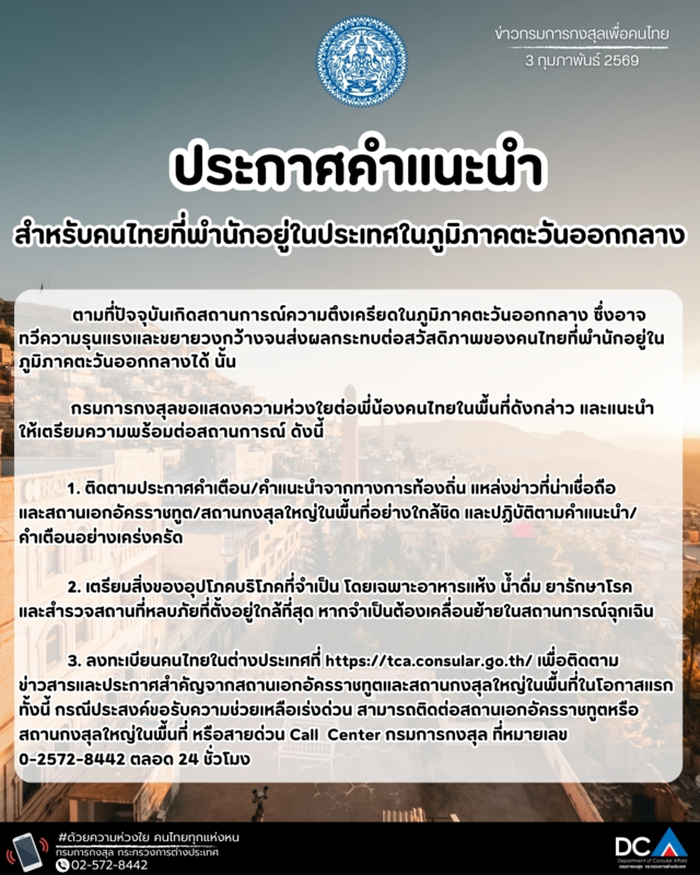 ตามที่ปัจจุบันเกิดสถานการณ์ความตึงเครียดในภูมิภาคตะวันออกกลาง ซึ่งอาจทวีความรุนแรงและขยายวงกว้างจนส่งผลกระทบต่อสวัสดิภาพของคนไทยที่พำนักอยู่ในภูมิภาคตะวันออกกลางได้ นั้น