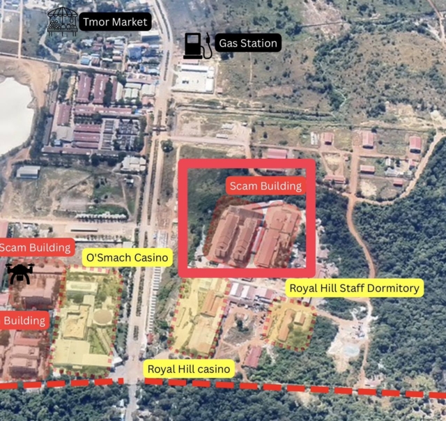 ในพื้นที่ที่เป็นโอเสม็ดคาสิโนรีสอร์ทและ Royal hill casino and resort พบว่ามีอาคารส่วนหนึ่งที่ถูกสร้างขึ้นมาไม่นานมานี้ถูกใช้เป็นฐานของพวก Scammer จากภาพข่าวที่เผยแพร่ออกมาพบว่า มีการตกแต่งห้องต่างๆให้เป็นสถานีตำรวจของนานาประเทศ เช่น จีน สิงคโปร์ ออสเตรเลีย บราซิล เวียดนามและยังพบกระดานที่มีข้อความภาษาอินโดนิเซีย ซึ่งเข้าใจว่ามีคนอินโดนิเซียส่วนหนึ่งเป็นเหยื่อของพวกชั่วเหล่านี้ รวมไปจนถึงตกแต่งเลียนแบบธนาคาร