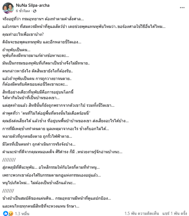 "จริงอยู่ที่ว่า กรมอุทยานฯ ต้องทำตามคำสั่งศาล แล้วกรมฯ ที่สมควรมีหน้าที่ดูแลสัตว์ป่า เคยช่วยพูดแทนหูพับไหมว่า ขอร้องศาลใช้วิธีอื่นได้ไหม
