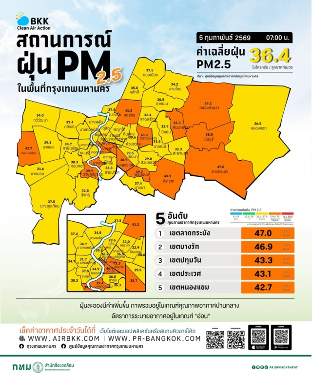 ศูนย์ข้อมูลคุณภาพอากาศกรุงเทพมหานคร ขอรายงานสถานการณ์ฝุ่นละอองขนาดไม่เกิน 2.5 ไมครอน (PM 2.5) ในกรุงเทพมหานคร ประจำวันที่ 5 กุมภาพันธ์ 2569 เวลา 07:00 น. ค่าเฉลี่ยของกรุงเทพมหานคร 36.4 ไมโครกรัมต่อลูกบาศก์เมตร (มคก./ลบ.ม.) (ค่ามาตรฐานไม่เกิน 37.5 มคก./ลบ.ม.)