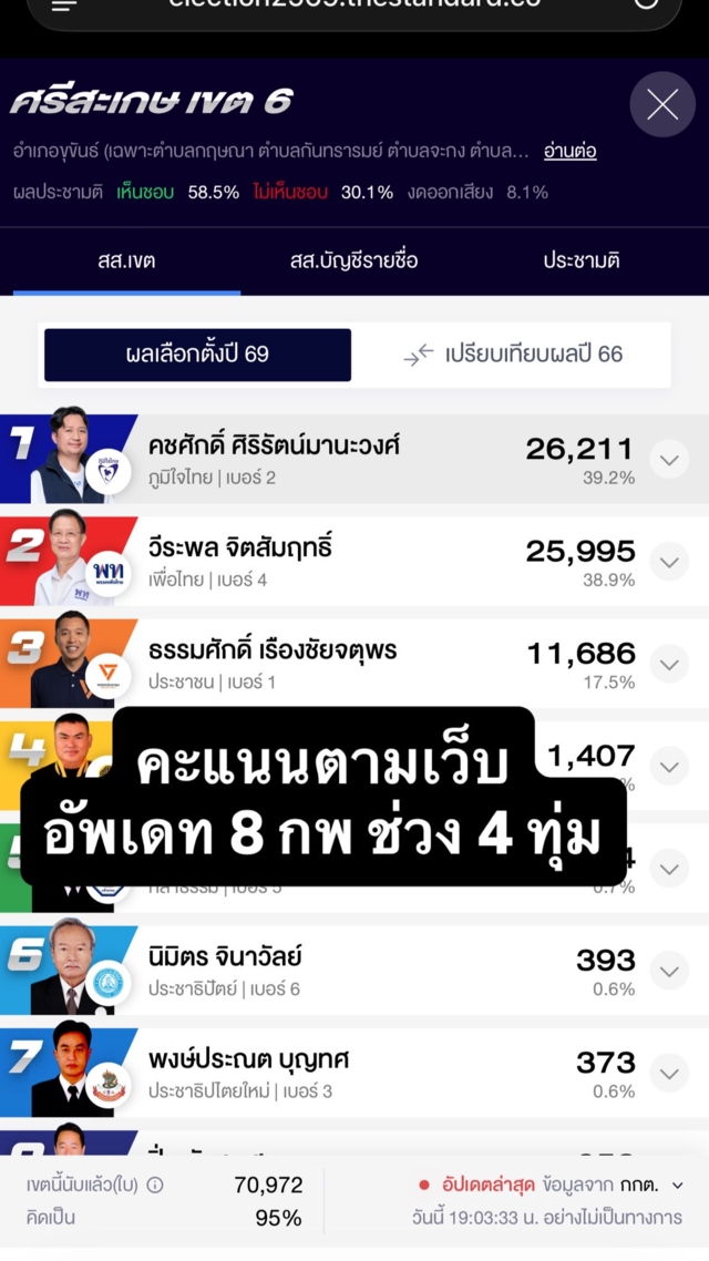 ขณะที่ก่อนหน้านี้ เว็ปไซต์ของกกต.ได้ระบุว่า นายคชศักดิ์ ศิริรัตน์มานะวงศ์ ผู้สมัครสส.ศรีสะเกษ เขต 6 พรรคภูมิใจไทย เบอร์ 2 มีคะแนนนำมาเป็นอันดับ 1 ผลคะแนน 26,211 คะแนน ส่วน นายวีระพล จิตสัมฤทธิ์ มีคะแนนมาเป็นอันดับ 2 ผลคะแนน 25,995 คะแนน คะแนนต่างกัน 216 คะแนน ข้อมูลจากเว็ปไซต์กกต.เมื่อเวลา 23.00 น. ของวันที่ 8 ก.พ. 2569 (อย่างไม่เป็นทางการ)