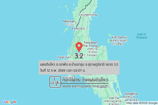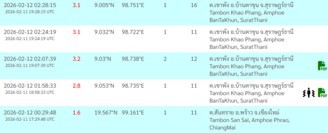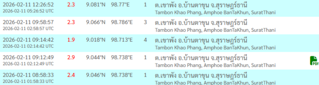 ในขณะที่เมื่อช่วงสายวานนี้ (11 ก.พ. 2569) ได้เกิดแผ่นดินไหว ต.เขาพัง อ.บ้านตาขุน จ.สุราษฎร์ธานี ติดต่อกัน 5 ครั้ง โดยมีรายงานดังนี้