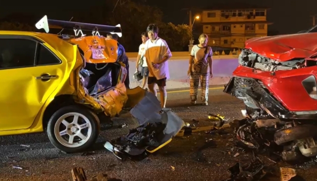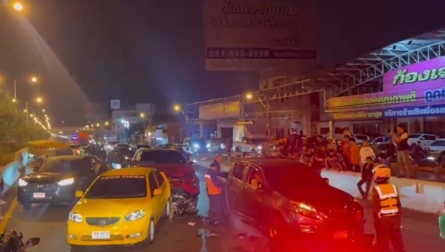 ในที่เกิดพบรถบรรทุกพ่วง 18 ล้อท้ายพ่วง ด้านท้ายถูกรถเก๋งอีก 3 คัน ลักษณะชนท้ายต่อกัน ใกล้เคียงยังพบรถจักรยานยนต์พ่วงข้างขายของล้มตะแคงพังเสียหาย และยังมีรถจักรยานยนต์อีก 1 คันพังเสียหายด้วย