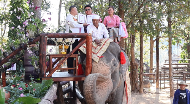 (14 ก.พ. 2569) เวลา 07.30 น. ที่ จ.ลำปาง บรรยากาศเป็นไปอย่างอบอุ่นและชื่นมื่น เริ่มต้นด้วยกิจกรรมทำบุญตักบาตรพระสงฆ์และพิธีผูกข้อมือเพื่อความเป็นสิริมงคลแก่คู่รัก ก่อนเข้าสู่ช่วงเวลาสำคัญของการจดทะเบียนสมรสบนหลังช้าง ซึ่งถือเป็นเอกลักษณ์หนึ่งเดียวของ จ.ลำปาง สะท้อนอัตลักษณ์เมืองแห่งช้างและเมืองรถม้าได้อย่างงดงาม