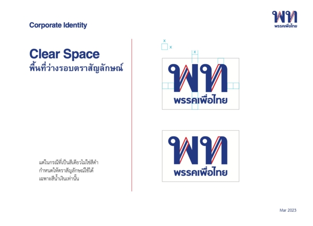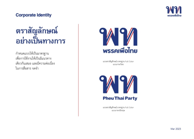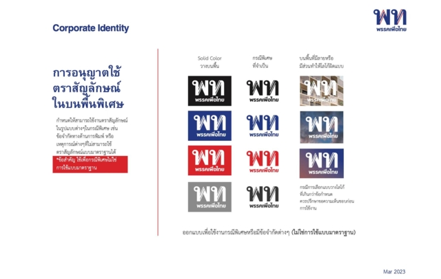 "งานออกแบบอัตลักษณ์ ไม่ได้มีโลโก้ แบบเดียวนะครับ โลโก้พรรคเพื่อไทย ผมเป็นคนปรับและออกแบบไว้ ตั้งแต่ 2023 เพื่อให้โลโก้ สามารถใช้ในหลายสถานการณ์ เช่น แคมเปญหาเสียง หรือ กรณีงานพิมพ์ ที่เป็น สีเดียว และทำให้โลโก้ไม่สามารถมองเห็นได้ชัดเจน หรือใช้เป็นกรณี พิเศษ