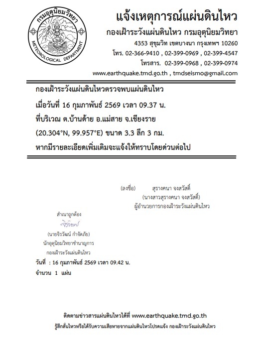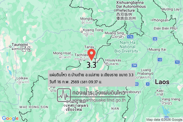 (16 ก.พ. 2569) กองเฝ้าระวังแผ่นดินไหว กรมอุตุนิยมวิทยา ได้ประกาศ แผ่นดินไหว ในพื้นที่ ต.บ้านด้าย อ.แม่สาย จ.เชียงราย วันนี้ (16 ก.พ. 2569) เวลา 09.37 น. ขนาด 3.3 ความลึก 3 กิโลเมตร