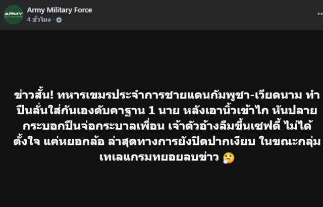 เพจ Army Military Force รายงานว่า ข่าวสั้น! ทหารเขมรประจำการชายแดนกัมพูชา-เวียดนาม ทำปืนลั่นใส่กันเองดับคาฐาน 1 นาย หลังเอานิ้วเข้าไก หันปลายกระบอกปืนจ่อกระบาลเพื่อน เจ้าตัวอ้างลืมขึ้นเซฟตี้ ไม่ได้ตั้งใจ แค่หยอกล้อ ล่าสุดทางการยังปิดปากเงียบ ในขณะกลุ่มเทเลแกรมทยอยลบข่าว
