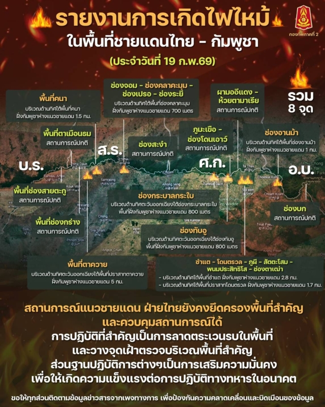 (19 ก.พ. 2569) จากกรณีที่กัมพูชามีการเผาป่าตามแนวชายแดนไทย - กัมพูชา ซึ่งมีการเผาอย่างต่อเนื่องหลายวัน ล่าสุด กองทัพภาคที่ 2 ได้สรุปสถานการณ์ไฟป่าบริเวณแนวชายแดนไทย - กัมพูชา ประจำวันที่ 19 ก.พ. 2569 รวม 8 จุด ได้แก่