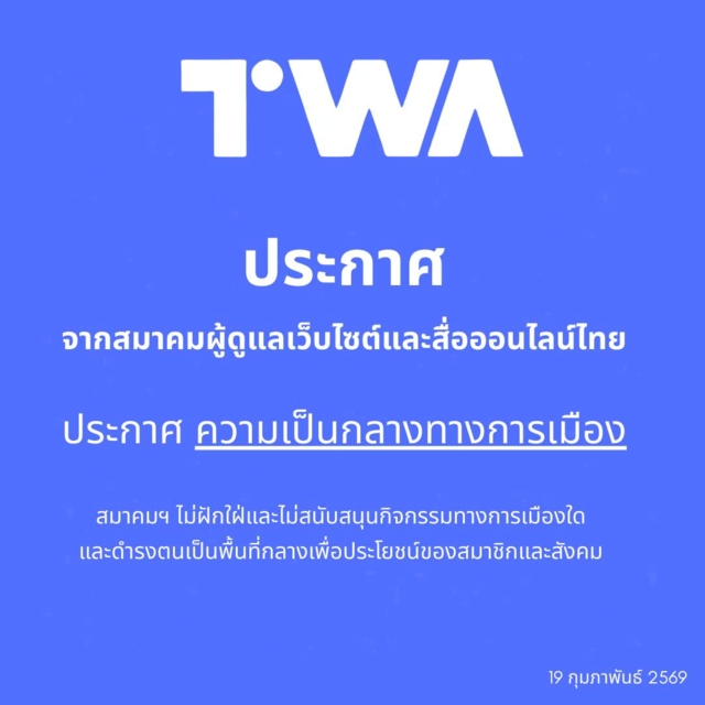 ล่าสุด ทาง สมาคมผู้ดูแลเว็บไซต์และสื่อออนไลน์ไทย (TWA) ได้ออกประกาศแสดงจุดยืน ความเป็นกลางทางการเมือง โดยมีเนื้อหาว่า สมาคมผู้ดูแลเว็บไซต์และสื่อออนไลน์ไทย (TWA) ก่อตั้งขึ้นจากการรวมตัวของบุคคลผู้มีความรู้ ความสามารถด้านการพัฒนาเว็บไซต์และสื่อออนไลน์ โดยมีวัตถุประสงค์เพื่อเป็นศูนย์กลางในการแลกเปลี่ยนความรู้ ประสบการณ์ และความคิดเห็นระหว่างสมาชิก หรือผู้ที่เกี่ยวข้อง ตลอดจนส่งเสริมการเผยแพร่ข้อมูลข่าวสารที่เป็นประโยชน์ต่อวงการ และช่วยยกระดับมาตรฐานวิชาชีพผู้ดูแลและพัฒนาเว็บไซต์ทั้งในด้านเทคโนโลยีสารสนเทศ วิชาการ และจริยธรรม ภายใต้หลักความเป็นกลาง และความน่าเชื่อถือในฐานะองค์กรวิชาชีพสื่อออนไลน์