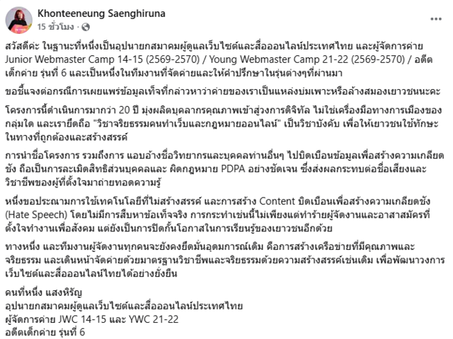 นอกจากนี้ คนที่หนึ่ง แสงหิรัญ อุปนายกสมาคมผู้ดูแลเว็บไซต์และสื่อออนไลน์ประเทศไทย ผู้จัดการค่าย JWC 14-15 และ YWC 21-22 ได้ออกมาโพสต์ข้อความชี้แจงถึงกรณีที่มีการเผยแพร่ข้อมูลเท็จที่กล่าวหาว่าค่ายของเราเป็นแหล่งบ่มเพาะหรือล้างสมองเยาวชน ว่า