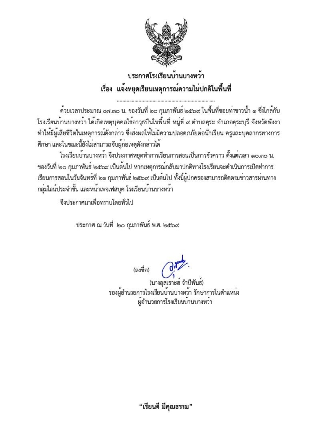 โรเรียนบ้านบางหว้า จึงประกาศหยุดทำการเรียนการสอนเป็นการชั่วคราว ตั้งแต่เวลา 10.30 น. ของวันที่ 20 กุมภาพันธ์ 2569 เป็นต้นไป หากเหตุการณ์กลับมาปกติทางโรงเรียนจะดำเนินการเปิดทำการเรียนการสอนในวันจันทร์ที่ 23 กุมภาพันธ์ 2569 เป็นต้นไป ทั้งนี้ผู้ปกครองสามารถติดตามข่าวสาวผ่านทางกลุ่มไลน์ประจำชั้น และหน้าเพจเฟซบุ๊ก โรงเรียนบ้านบางหว้า