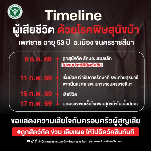 โดยผู้เสียชีวิตรายแรกของ จ.นครราชสีมา เป็นเพศชาย อายุ 53 ปี ชื่อ นายเสกสรร ชาว ต.โพธิ์กลาง อ.เมืองนครราชสีมา มีประวัติถูกสุนัขกัดขาทั้งสองข้าง บาดแผลเล็ก เมื่อวันที่ 6 ธ.ค. 2569 จึงไม่ได้เข้ารับการรักษาฉีดวัคซีนป้องกันโรคพิษสุนัขบ้า ต่อมา วันที่ 11 ก.พ. 2569 เริ่มมีอาการป่วย มีไข้ มีเสมหะ ปัสสาวะไม่ออก วันที่ 13 ก.พ. 2569 จึงเจ้ารับการรักษาที่ รพ.ค่ายสุรนารี แต่อาการไม่ดีขึ้น และมีอาการอื่นเพิ่มเติม คือ ไม่มีแรง กลืนอาหารและดื่มน้ำไม่ได้ จึงส่งเข้ารับการรักษาต่อ ที่ รพ.มหาราชนครราชสีมา แต่อาการทรุดลงและเสียชีวิตในวันที่ 15 ก.พ. 2569 และเมื่อนำร่างส่งชันสูตร 17 ก.พ. 2569 ยืนยันผลตรวจจากห้องปฏิบัติการ พบสารพันธุกรรมไวรัสพิษสุนัขบ้าจากตัวอย่างเนื้อสมอง ซึ่งขณะนี้อยู่ระหว่างสอบสวนโรคเพิ่มเติม และเฝ้าระวังคุมเข้มพื้นที่เสี่ยง ภายใต้การกำกับของคณะกรรมการศูนย์ปฏิบัติการฉุกเฉินด้านการแพทย์และสาธารณสุข