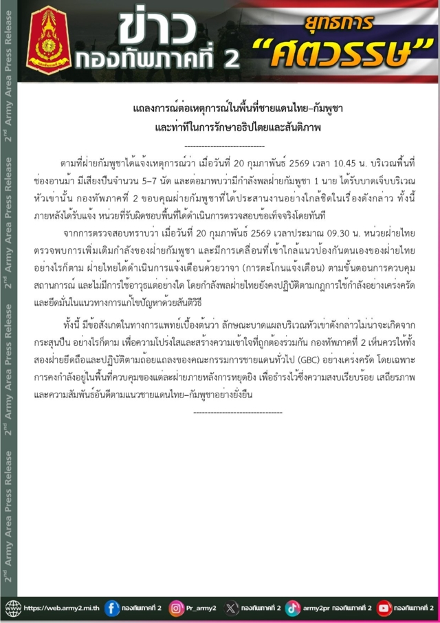 (21 ก.พ. 2569) กองทัพภาคที่ 2 ชี้แจง กรณีเหตุการณ์บริเวณพื้นที่ช่องอานม้า ตามที่ฝ่ายกัมพูชาได้แจ้งเหตุการณ์ว่า เมื่อวันที่ 20 ก.พ. 2569 เวลา 10.45 น. บริเวณพื้นที่ช่องอานม้า มีเสียงปืนจำนวน 5-7 นัด และต่อมาพบว่ามีกำลังพลฝ่ายกัมพูชา 1 นาย ได้รับบาดเจ็บบริเวณหัวเข่านั้น กองทัพภาคที่ 2 ขอบคุณฝ่ายกัมพูชาที่ได้ประสานงานอย่างใกล้ชิดในเรื่องดังกล่าว ทั้งนี้ ภายหลังได้รับแจ้ง หน่วยที่รับผิดชอบพื้นที่ได้ดำเนินการตรวจสอบข้อเท็จจริงโดยทันที
