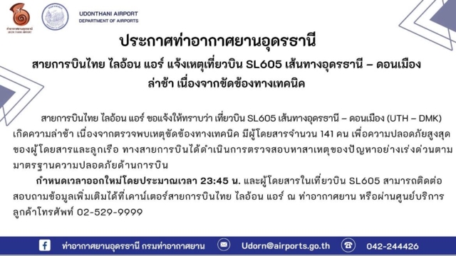 จากกรณีผู้โดยสารเที่ยวบิน SL605 เส้นทางอุดรธานี-ดอนเมือง สายการบินไทย ไลอ้อน แอร์ แจ้งว่าไปรอขึ้นเครื่องไปกรุงเทพฯ จากนั้นมีประกาศเครื่องดีเลย์จากเวลา 12.55 น. ดีเลย์ไป 13.40 น. ครั้งที่ 2 ประกาศอีกว่าเลื่อนเที่ยวบินโดยไม่มีกำหนด สักพักได้มีการประกาศเป็นครั้งที่ 3 ยกเลิกเที่ยวบิน เจ้าหน้าที่บอกว่าเครื่องขัดข้องทางเทคนิค และจะซ่อมเสร็จตอนเที่ยงคืนนั้น