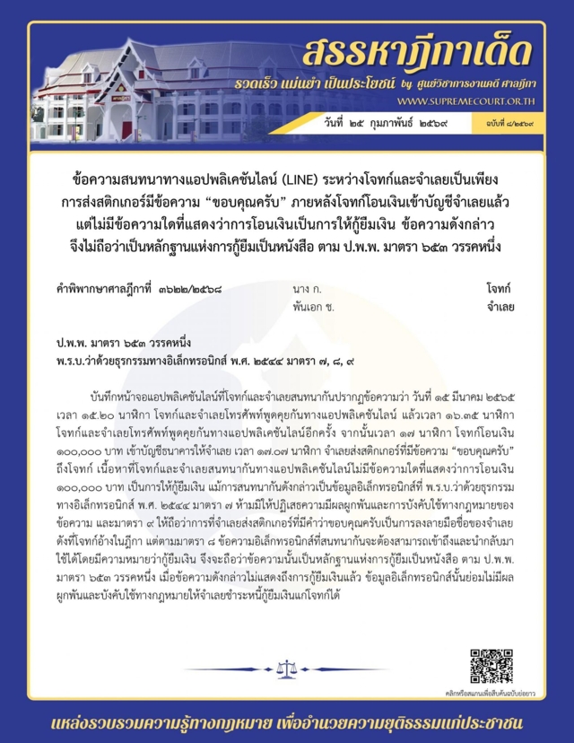 โดยระบุว่า ข้อความสนทนาทางแอปพลิเคชันไลน์ (LINE) ระหว่างโจทก์และจำเลยเป็นเพียงการส่งสติกเกอร์มีข้อความ “ขอบคุณครับ” ภายหลังโจทก์โอนเงินเข้าบัญชีจำเลยแล้ว แต่ไม่มีข้อความใดที่แสดงว่าการโอนเงินเป็นการให้กู้ยืมเงิน ข้อความดังกล่าว จึงไม่ถือว่าเป็นหลักฐานแห่งการกู้ยืมเป็นหนังสือ ตาม ป.พ.พ. มาตรา 653 วรรคหนึ่ง