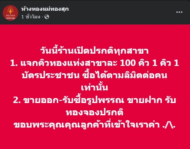 โดยระบุว่า แจกคิวซื้อทองคำแท่ง จำกัดเพียงสาขาละ 100 คิว เท่านั้น เงื่อนไขการรับสิทธิ์: 1 คิว ต่อ 1 บัตรประชาชน (ต้องแสดงตัวตนจริง) สามารถซื้อได้ตาม ลิมิตที่กำหนดต่อคน (เพื่อกระจายทองคำให้ทั่วถึง)