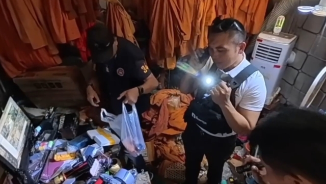 เมื่อเจ้าหน้าที่เดินทางไปถึงพบพระสุวรรณ อายุ 40 ปี กำลังอยู่ภายในกุฏิ เจ้าหน้าที่จึงเรียกตัวออกมาสอบถาม โดยพระสุวรรณ ให้การยอมรับว่า ได้เสพยาบ้า 2 เม็ด เมื่อ 5-6 วันก่อน เจ้าหน้าที่จึงทำการตรวจปัสสาวะพบสารเสพติดในร่างกาย เข้าตรวจค้นภายในกุฏิมีขยะจำนวนมากกองสะสมเต็มพื้น ส่งกลิ่นเหม็นคลุ้งไปทั่วบริเวณพบอาวุธปืนขนาด 22 จำนวน 2 กระบอก อาวุธปืนบีบีกันจำนวน 3 กระบอก พร้อมเครื่องกระสุนปืนรวม 41 นัด เจ้าหน้าที่จึงทำการตรวจยึดไว้เป็นหลักฐาน