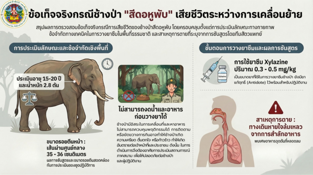 ส่วนรายละเอียดขั้นตอนการวางยาซึมและการเคลื่อนย้ายข้อเท็จจริงการประเมินรูปลักษณ์และน้ำหนักทีมแพทย์ผู้เชี่ยวชาญได้ประเมินน้ำหนักจากระยะไกลไว้ที่ 2.3-2.5 ตัน ซึ่งผลชันสูตรจริง คือ 2.8 ตัน และประเมินอายุไว้ที่ 15-20 ปี ซึ่งสอดคล้องกับลักษณะกายภาพที่ปรากฏ นอกจากที่ใบหูและรอยตีนแล้วยังพบช้างป่ามีอาการตกมันเมื่อเดือนกันยายนปี 68 สอดคล้องกับผลวิจัยวิชาการที่อ้างอิงการใช้ยาซึมในช่วงการปฎิบัติงานรวม 4 ชั่วโมง 36 นาที มีการใช้ยาซึมรวม 5 ครั้ง ปริมาณ 27 มิลลิลิตร เพื่อรักษาระดับการซึมตามการตอบสนองของสัตว์ ซึ่งทีมสัตวแพทย์ยืนยันว่าเป็นไปตามหลักวิชาการและไม่เกินกว่าขนาดยาปกติสำหรับการจัดการช้างป่า โดยมีข้อจำกัดการปฎิบัติงานในช้างป่าธรรมชาติที่ไม่สามารถควบคุมการงดน้ำและอาหารได้เหมือนสัตว์เลี้ยง ประกอบกับพื้นที่เกิดเหตุเป็นไร่อ้อยและมันสำปะหลัง ซึ่งเป็นปัจจัยเสียงสำคัญสำหรับการเสียชีวิต ผลชันสูตรโดยละเอียดระบุว่าเกิดเกิดจากระบบทางเดินหายใจล้มเหลว