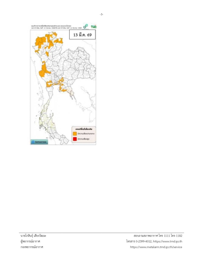 กรมอุตุนิยมวิทยา ประกาศเตือน เรื่อง พายุฤดูร้อนบริเวณประเทศไทยตอนบน (มีผลกระทบในช่วงวันที่ 11-13 มีนาคม 2569) ฉบับที่ 1 ในช่วงวันที่ 11-13 มี.ค. 2569 บริเวณประเทศไทยตอนบนจะมีพายุฤดูร้อนเกิดขึ้น โดยเริ่มจากภาคเหนือก่อน ส่วนภาคกลาง ด้านตะวันตกของภาคตะวันออกเฉียงเหนือ และภาคตะวันออก รวมทั้งกรุงเทพมหานครและปริมณฑล จะได้รับผลกระทบในระยะต่อไป โดยจะมีลักษณะของพายุฝนฟ้าคะนอง ลมกระโชกแรง ลูกเห็บตก และฝนตกหนักบางแห่ง รวมถึงฟ้าผ่าที่อาจเกิดขึ้นได้บางพื้นที่ เนื่องจากในระยะแรกคลื่นกระแสลมฝ่ายตะวันตกจากประเทศเมียนมาจะเคลื่อนเข้าปกคลุมภาคเหนือ ประกอบกับจะมีบริเวณความกดอากาศสูงหรือมวลอากาศเย็นกำลังปานกลางอีกระลอกหนึ่งจากประเทศจีนเคลื่อนเข้าปกคลุมภาคตะวันออกเฉียงเหนือ ภาคตะวันออก และทะเลจีนใต้ ในขณะที่ประเทศไทยตอนบนมีอากาศร้อน