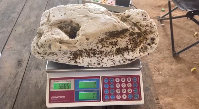 เมื่อนำมาชั่งกิโลปรากฏตัวเลข 5.685 กก. ลองนำมือสัมผัส จะลื่นคล้ายเทียน ที่ทำจากไขมันสัตว์ ก้อนอ้วกวาฬมีกลิ่นเฉพาะตัว มีสีขาว
