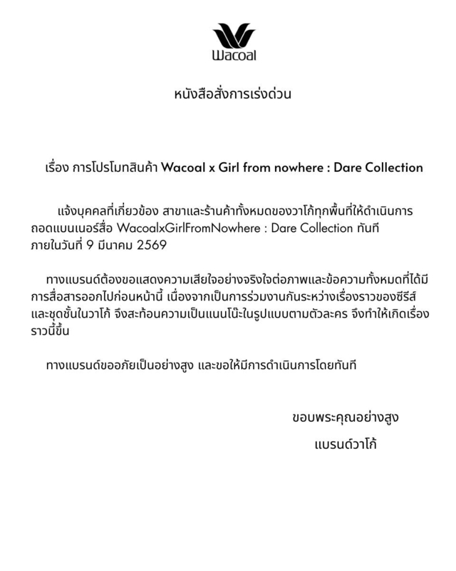 แจ้งบุคคลที่เกี่ยวข้อง สาขาและร้านค้าทั้งหมดของวาโก้ทุกพื้นที่ให้ดำเนินการถอดแบบเนอร์สื่อ Wacoal x Girl From nowhere : Dare Collection ทันที ภายในวันที่ 9 มีนาคม 2569