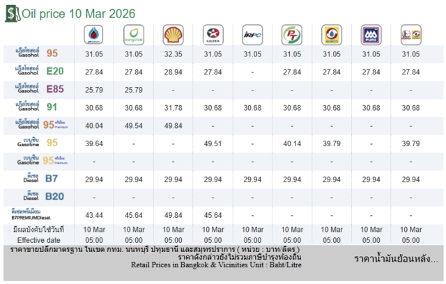 ราคาน้ำมันวันนี้! ประกาศราคาน้ำมันล่าสุด (10 มี.ค. 2569) ปตท.- บางจาก ประกาศปรับราคาน้ำมัน เช็ก ราคาน้ำมันจาก 5 ปั๊มใหญ่ วันนี้