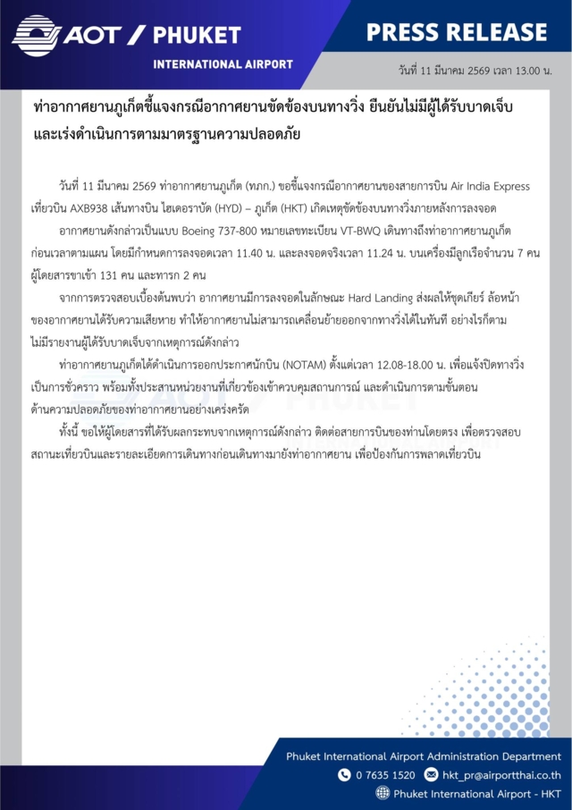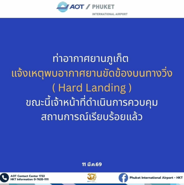 (11 มี.ค. 2569) เจ้าหน้าที่ตำรวจ สภ.สาคู และตำรวจท่องเที่ยวประจำท่าอากาศยานภูเก็ตได้รับแจ้งเหตุ อากาศยานของสายการบิน Air India Express เที่ยวบิน AXB938 / IX938 เส้นทางจากเมืองไฮเดอราบัด ประเทศอินเดีย มุ่งหน้าสู่ท่าอากาศยานภูเก็ต จ.ภูเก็ต เกิดเหตุขัดข้องระหว่างลงจอด โดยล้อหน้าของอากาศยานไม่กางขณะทำการลงจอดบนทางวิ่ง