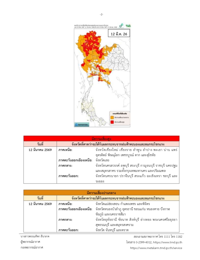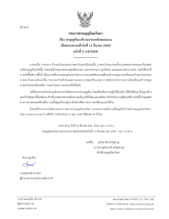 กรมอุตุนิยมวิทยา ประกาศเตือน เรื่อง พายุฤดูร้อนบริเวณประเทศไทยตอนบน (มีผลกระทบจนถึงวันที่ 13 มี.ค. 2569) ฉบับที่ 4 ภาคเหนือ ภาคกลาง ด้านตะวันตกของภาคตะวันออกเฉียงเหนือ ภาคตะวันออกรวมทั้งกรุงเทพมหานครและปริมณฑล จะมีพายุฤดูร้อนเกิดขึ้น โดยจะมีลักษณะของพายุฝนฟ้าคะนอง ลมกระโชกแรง ลูกเห็บตก และฝนตกหนักบางแห่ง รวมถึงฟ้าผ่าที่อาจเกิดขึ้นได้บางพื้นที่ เนื่องจากคลื่นกระแสลมฝ่ายตะวันตกจากประเทศเมียนมาเคลื่อนเข้าปกคลุมภาคเหนือและด้านตะวันตกของภาคตะวันออกเฉียงเหนือ ประกอบกับมีบริเวณความกดอากาศสูงหรือมวลอากาศเย็นกำลังปานกลางได้เคลื่อนเข้าปกคลุมภาคตะวันออกเฉียงเหนือ ภาคตะวันออก และทะเลจีนใต้แล้ว