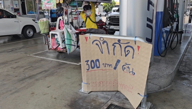 เช่น ที่ปั๊มน้ำมัน ปตท. ไชยนาม อำเภอวังทอง จังหวัดพิษณุโลก ปั๊มน้ำมันแห่งนี้เป็นปั๊มขนาดใหญ่ อยู่บนถนทางหลวงหมายเลข 12 เป็นเส้นทางหลัก จากจังหวัดพิษณุโลก ไป เขาค้อ และภาคอีสาน จึงทำให้มีจำนวนผู้มาใช้บริการเติมน้ำมันอย่างต่อเนื่องตลอดทั้งวันและจำนวนมาก และด้วยสถานการณ์ปัจจุบันจึงทำให้ ทำให้พนักงานปั๊มตัดสินใจเขียนป้ายประกาศแจ้งให้ผู้มาใช้บริการได้ทราบว่าจำกัดให้เติมคันละ 300 บาท และไม่กรอกใส่ถังทุกชนิด