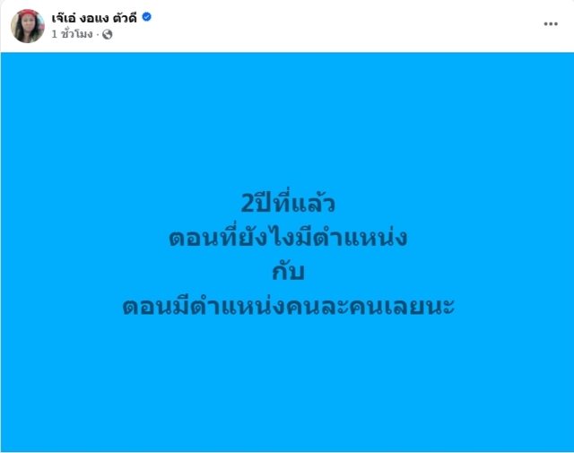 ต่อมาก็ได้โพสต์ข้อความอีกว่า “2 ปีที่แล้ว ตอนที่ยังไงมีตำแหน่ง กับตอนมีตำแหน่งคนละคนเลยนะ”