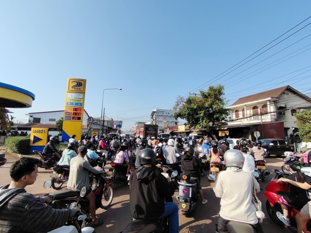 บรรยากาศในเวียงจันทน์ ปั๊มน้ำมันหลายแห่งในนครหลวงเวียงจันทน์ติดป้าย "น้ำมันหมด" ส่วนปั๊มที่ยังเปิดอยู่มีแถวคิวยาวเหยียดของทั้งรถยนต์และรถจักรยานยนต์ ซึ่งบางแห่งต้องจำกัดปริมาณการเติมต่อคัน