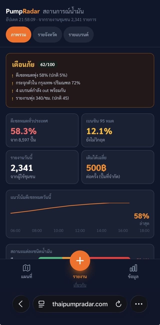 จากสถานการณ์น้ำมันวันนี้ ผมเลยลองพัฒนาแพลตฟอร์มตัวหนึ่งขึ้นมา PumpRadar — Community Fuel Intelligence แพลตฟอร์มที่ให้ประชาชนช่วยกันรายงาน สถานะปั๊มน้ำมันแบบเรียลไทม์ คุณสามารถ