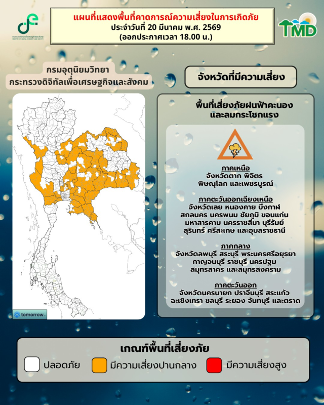 กรมอุตุนิยมวิทยา พยากรณ์อากาศ 24 ชั่วโมงข้างหน้า ประเทศไทยตอนบนมีอากาศร้อนในตอนกลางวัน โดยบริเวณภาคตะวันออกเฉียงเหนือและภาคตะวันออกมีฝนเพิ่มขึ้น ซึ่งจะมีลักษณะของฝนฟ้าคะนอง ลมกระโชกแรง และลูกเห็บตกบางแห่ง ส่วนมากบริเวณภาคเหนือตอนล่าง ภาคตะวันออกเฉียงเหนือ ภาคกลาง และภาคตะวันออก เนื่องจากความกดอากาศต่ำเนื่องจากความร้อนปกคลุมประเทศไทยตอนบน ในขณะที่ลมใต้และลมตะวันออกเฉียงใต้ที่พัดนำความชื้นจากทะเลจีนใต้และอ่าวไทยเข้ามาปกคลุมบริเวณประเทศไทยตอนบนมีกำลังแรงขึ้น ขอให้ประชาชนบริเวณประเทศไทยตอนบนระวังอันตรายฝนฟ้าคะนองและลมกระโชกแรง โดยหลีกเลี่ยงการอยู่ในที่โล่งแจ้ง ใต้ต้นไม้ใหญ่ สิ่งปลูกสร้าง และป้ายโฆษณาที่ไม่แข็งแรง สำหรับเกษตรกรควรเสริมความแข็งแรงให้ไม้ผล และเตรียมการป้องกันความเสียหายที่อาจเกิดขึ้นกับผลผลิตทางการเกษตรและสัตว์เลี้ยง รวมทั้งดูแลรักษาสุขภาพเนื่องจากสภาพอากาศที่ร้อนไว้ด้วย