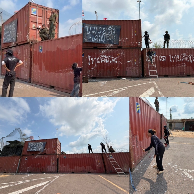 โดย กันจอมพลัง โพสต์เฟซบุ๊กระบุว่า ลบออกเรียบร้อย หลังคนเขมรมาเขียนด่าคนไทยว่าเป็นโจรที่รั้วตู้คอนเทนเนอร์ ตอนที่ลงไปหน้าตู้ ทหารเรือช่วยคุ้มครองความปลอดภัยให้ เพราะคนเขมรมารวมตัวกัน บางคนก็มาโวยวายไม่ให้ลบ แต่เราก็ลบอยู่ดีนี่คือการลบครั้งที่ 2 แล้วครับ
