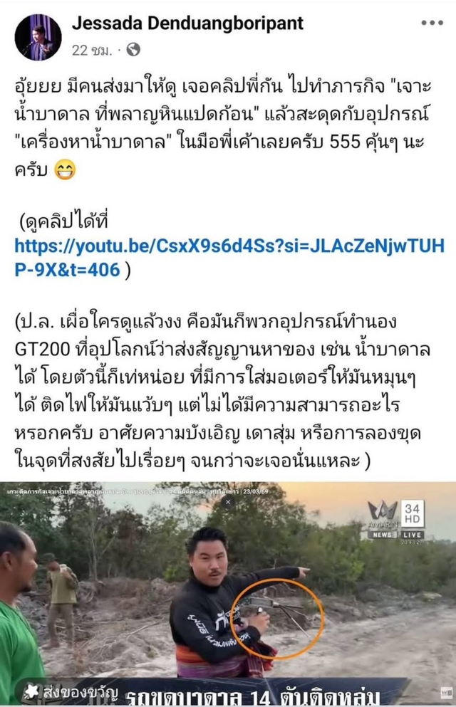 ในโลกออนไลน์ มีการแชร์คลิปของนักขุดหาน้ำบาดาล โดยใช้เครื่องมือที่ดูแปลกตา อ้างว่าซื้อมาจากต่างประเทศ สามารถใช้เครื่องนี้ชี้จุดที่มีน้ำบาดาลซ่อนอยู่ใต้ดินได้