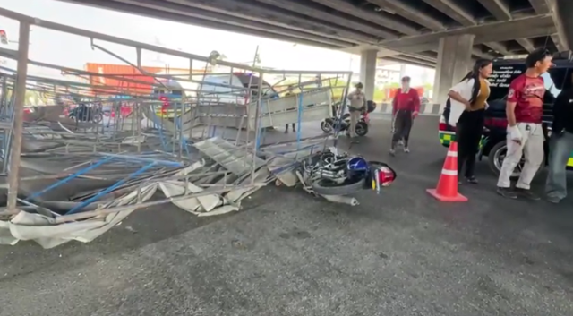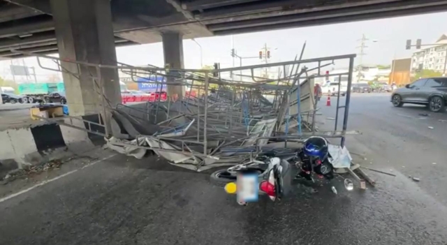 เมื่อเวลา 15.00 น. (27 มี.ค. 2569) เจ้าหน้าที่ตำรวจ สภ.เมืองชลบุรี กู้ภัยธรรมรัศมีมณีรัตน์ ได้รับแจ้งมีอุบัติเหตุ นั่งร้านพังถล่มลงมาทับรถจักรยานยนต์ ใต้สะพานต่างระดับบายพาสพนัสนิคม แยกไฟแดงเตือนใจ ขาเข้าพนัสนิคม ต.นาป่า อ.เมืองชลบุรี จ.ชลบุรี จึงรุดไปตรวจสอบที่เกิดเหตุ