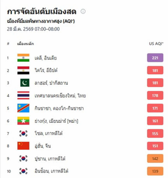 ขณะที่เว็บไซต์ IQAir ซึ่งจัดลำดับเมืองที่มีมลพิษทางอากาศมากที่สุดของโลกเช้าวันนี้ เมื่อเวลา 07:00 น. เทศบาลนครเชียงใหม่ยังคงอยู่อันดับที่ 4 ของโลก ด้านมลพิษทางอากาศ โดยดัชนีคุณภาพอากาศวัดได้ 178 USAQI ขณะที่ค่าฝุ่น PM2.5 วัดได้ 94.2 ไมโครกรัมต่อลูกบาศก์เมตร ส่วนอันดับที่ 1 คือ กรุงเดลี ประเทศอินเดีย มีดัชนีคุณภาพอากาศอยู่ที่ 221 USAQI