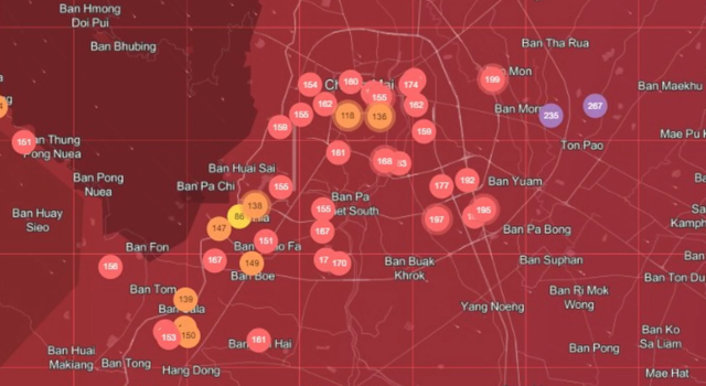 ส่วนข้อมูลของกรมควบคุมมลพิษ เมื่อเวลา 08:00 น. จากสถานีตรวจวัดคุณภาพอากาศทั้ง 6 จุด ของ จ.เชียงใหม่ พบว่า ค่าฝุ่นเกินมาตรฐานอยู่ในระดับสีส้มและสีแดง โดยใน อ.เมือง สูงสุดที่ ต.ช้างเผือก อ.เมือง จ.เชียงใหม่ ดัชนีคุณภาพอากาศวัดได้ 168 AQI ค่าฝุ่น PM2.5 อยู่ที่ 62.9 ไมโครกรัมต่อลูกบาศก์เมตร ขณะที่ค่าสูงสุดของเช้าวันนี้อยู่ในระดับสีแดงที่ ต.เมืองนะ อ.เชียงดาว ดัชนีคุณภาพอากาศอยู่ที่ 293 AQI ค่าฝุ่น PM2.5 พุ่งสูงถึง 167.7 ไมโครกรัมต่อลูกบาศก์เมตร