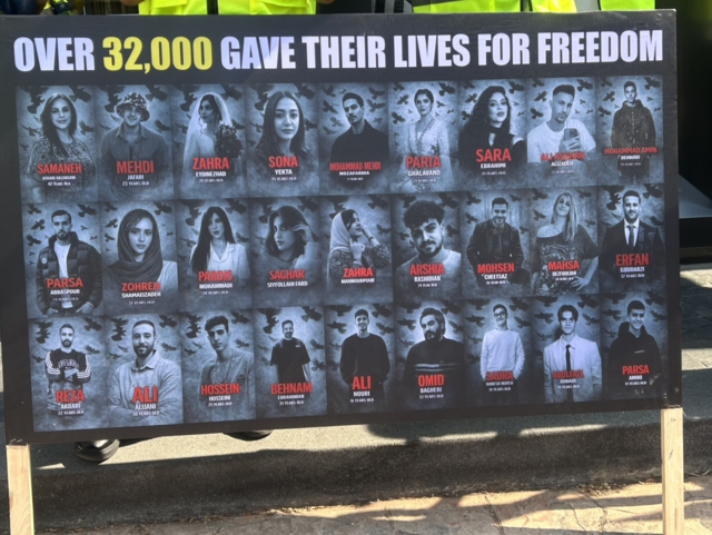 โดยมีการนำรูปภาพของชาวอิหร่านที่ถูกกดขี่สังหารจากความขัดแย้งในประเทศมาแสดงออก และข้อความต่างๆ ที่สื่อถึงข้อเรียกร้องที่อยากให้ประเทศเกิดการเปลี่ยนแปลงและให้รัฐบาลปัจจุบันลาออก รวมทั้งยังได้กล่าวสรรเสริญอดีตกษัตริย์อิหร่านเป็นภาษาฟาร์ซี ซึ่งเป็นภาษาราชการของอิหร่าน และยังร่วมร้องเพลงชาติอิหร่านด้านหน้าสถานทูต