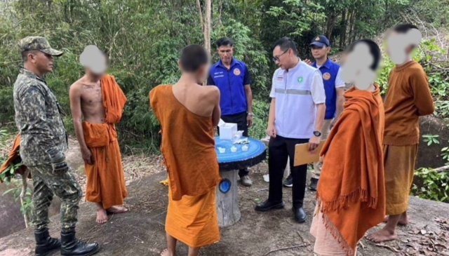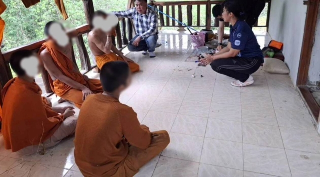 สืบสวนเพิ่มเติมทำให้ทราบว่า พระอาม เป็นคน อ.เพ็ญ จ.อุดรธานี เพิ่งบวชเมื่อต้นปี 2569 ส่วนสามเณร 4 รูป มาจาก จ.สมุทรปราการ 2 รูป จ.บึงกาฬ 1 รูป และเป็นคนในพื้นที่อีก 1 รูป อายุระหว่าง 13-17 ปี โดยทั้งหมดมีพฤติกรรมข้องเกี่ยวกับยาเสพติดจริง จึงได้ร่วมเดินทางไปยังสำนักสงฆ์ดังกล่าวพบ สามเณรเอ (นามสมมติ) อายุ 13 ปี ยืนอยู่ตรงซุ้มประตูทางเข้า สอบถามได้ความว่าออกมาเดินเล่นเพราะอากาศร้อน แต่สามเณรเอมีท่าทีลุกลี้ลุกลน เจ้าหน้าที่จึงให้พาไปหาอีก 4 รูป ที่ปิดประตูอยู่รวมกันภายในกุฏิ พร้อมกระจายกำลังล้อมกุฏิต้องสงสัยไว้