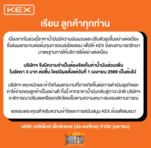 ด้านเฟซบุ๊ก Kerry Express ของบริษัท เคอีเอ็กซ์ เอ็กซ์เพรส (ประเทศไทย) จำกัด (มหาชน) โพสต์ข้อความแจ้งว่า เรียน ลูกค้าทุกท่าน เนื่องจากในช่วงนี้ราคาน้ำมันมีความผันผวนและปรับตัวสูงขึ้นอย่างต่อเนื่อง ซึ่งส่งผลกระทบต่อต้นทุนการขนส่งโดยตรง เพื่อให้ KEX ยังคงสามารถรักษามาตรฐานการให้บริการได้อย่างต่อเนื่อง บริษัทฯ จึงมีความจำเป็นต้องจัดเก็บค่าน้ำมันส่วนเพิ่ม ในอัตรา 3 บาท ต่อชิ้น โดยมีผลตั้งแต่วันที่ 1 เม.ย. 2569 เป็นต้นไป